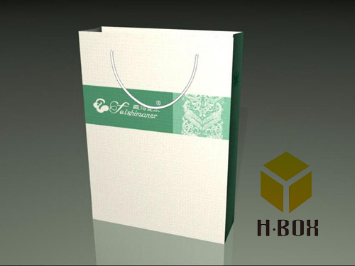 手提袋使用亚光膜覆膜,进口海德堡四色胶印机印刷,绿色编织夹心提绳。